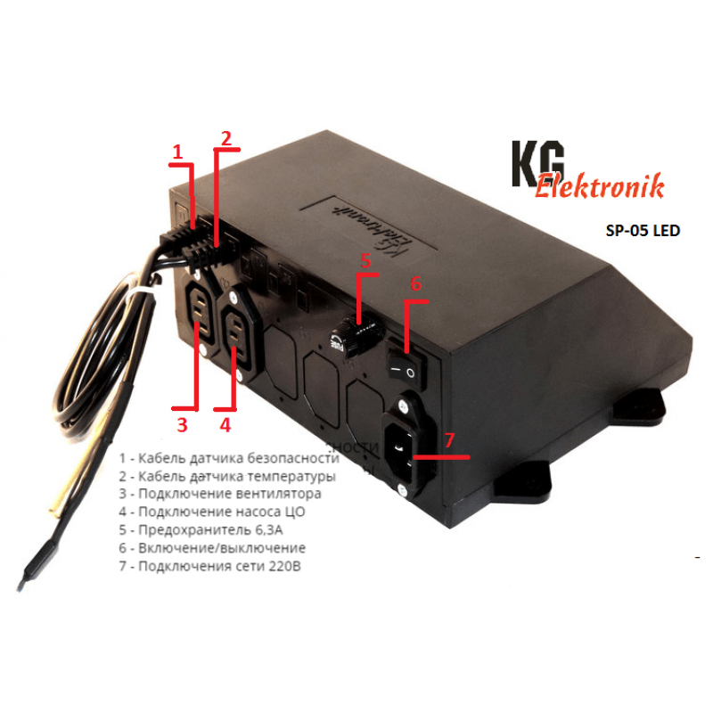 Управляет насосом центрального отопления и нагнетающим вентилятором. Предназначена для регулирования котлами с использованием твердого топлива, древесины, угля, опилок. Пользователь KG Elektronik SP-05LED имеет выбор из 5 версий режимов работы регулятора обусловленных видом топлива, а также типом котла. 4 автоматические функции и 1 ручная.