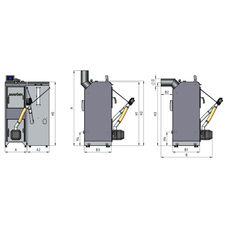 • топливным бункером для хранения пеллет в исполнении STANDART 440 литров или BIO 450 литров (опция), которые, как и дверцы котла могут быть установлены по требованию заказчика на левую или на правую сторону.