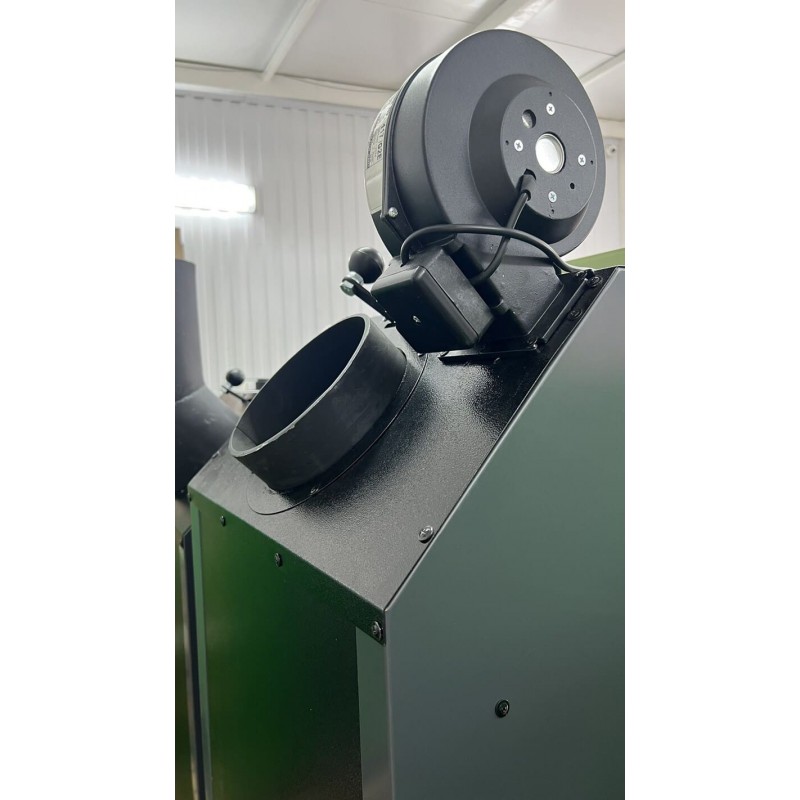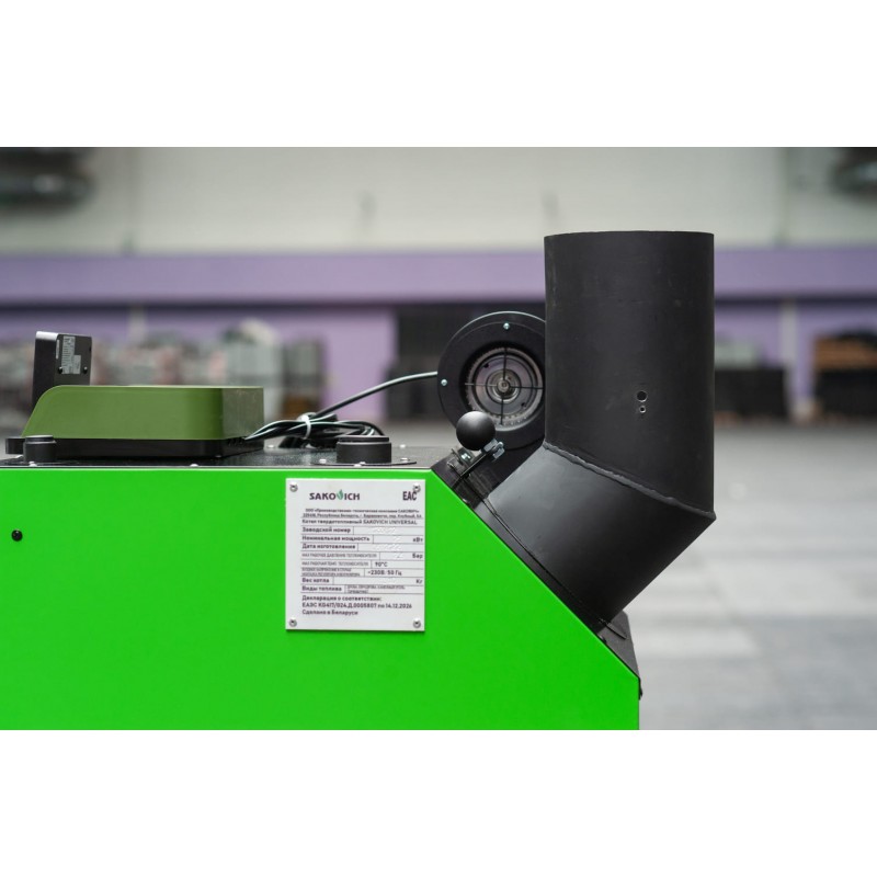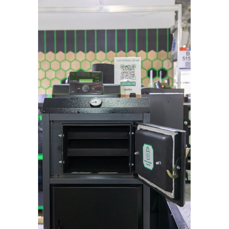 Котёл UNIVERSAL приспособлен для работы в режиме верхнего и нижнего сгорания. Используя принудительный поток воздуха, нагнетаемый вентилятором через отверстия в камере сгорания, обеспечивает сжигание засыпного топлива с содержанием угольной пыли, щепы и опилки не более 30%